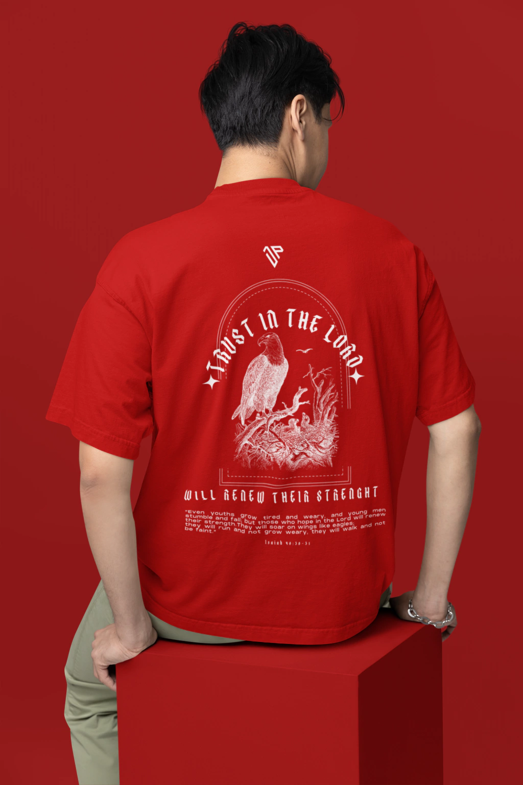 Inspirada no versículo de Isaías 40:31: "Mas os que esperam no Senhor renovarão as forças, subirão com asas como águias; correrão, e não se cansarão; caminharão, e não se fatigarão", esta camiseta é um lembrete constante da promessa divina de renovação e força para aqueles que confiam no Senhor. A frase em inglês "Trust in the Lord, Will Renew Their Strength" reforça essa mensagem, incentivando a juventude a depositar sua fé e esperança em Deus.